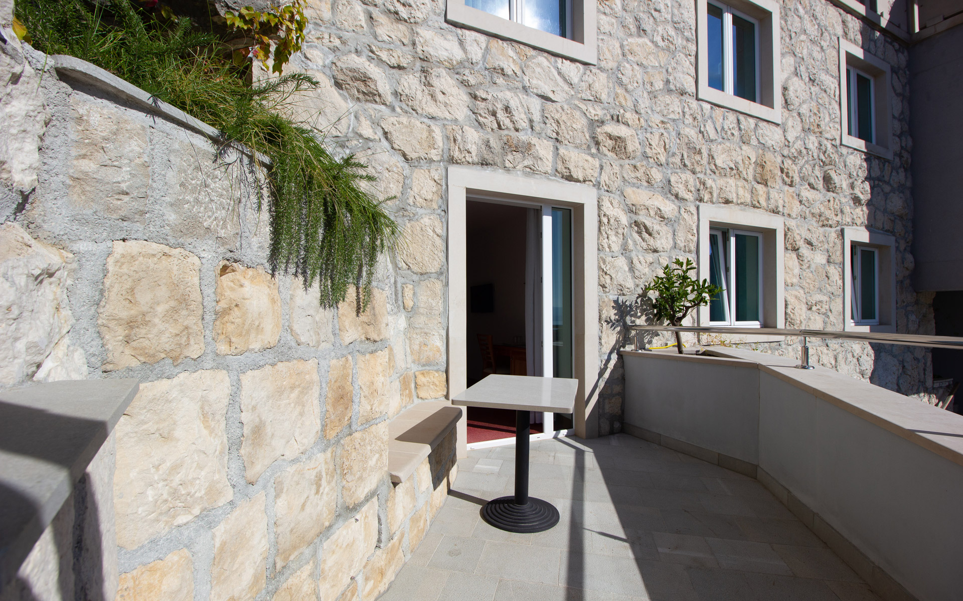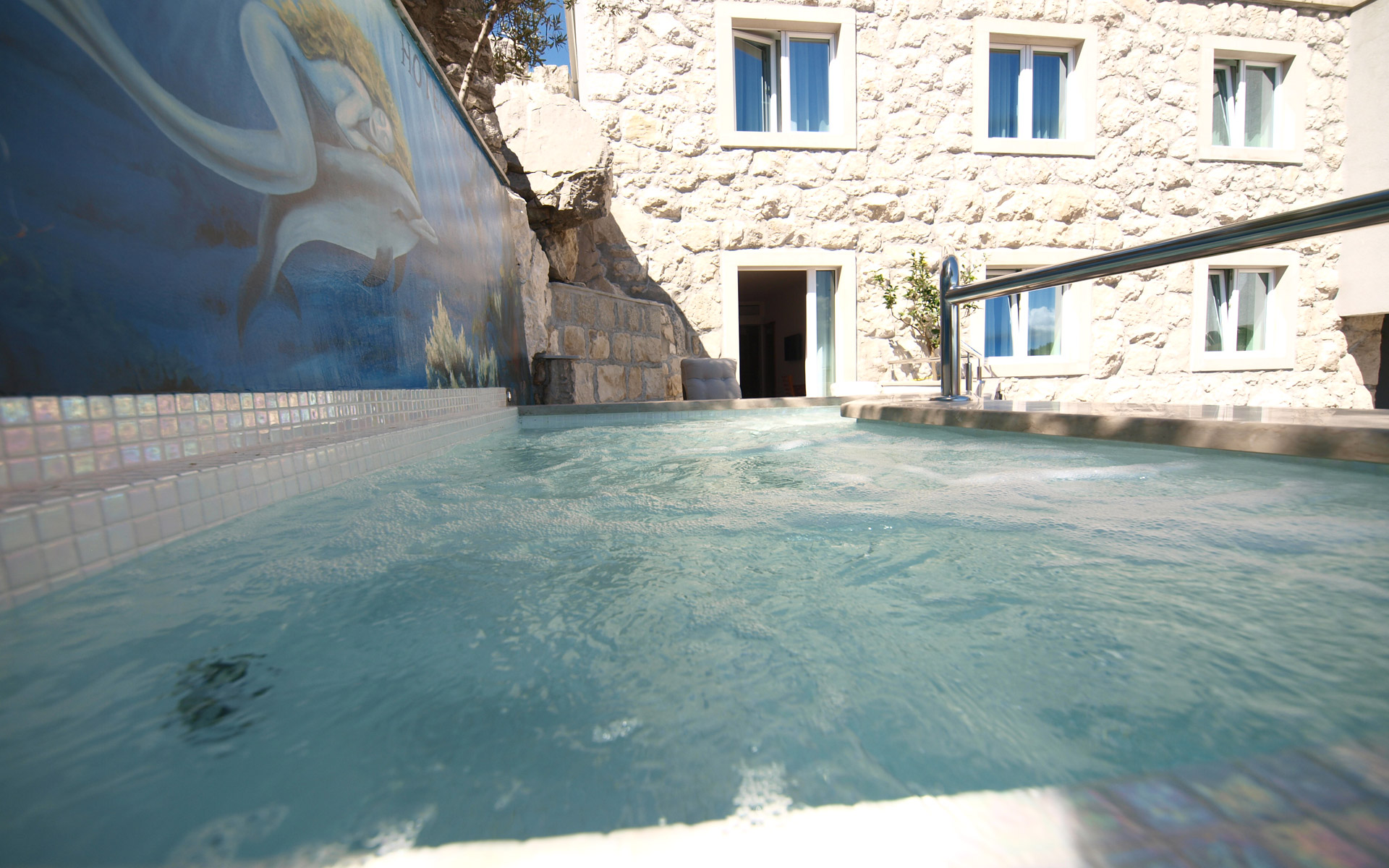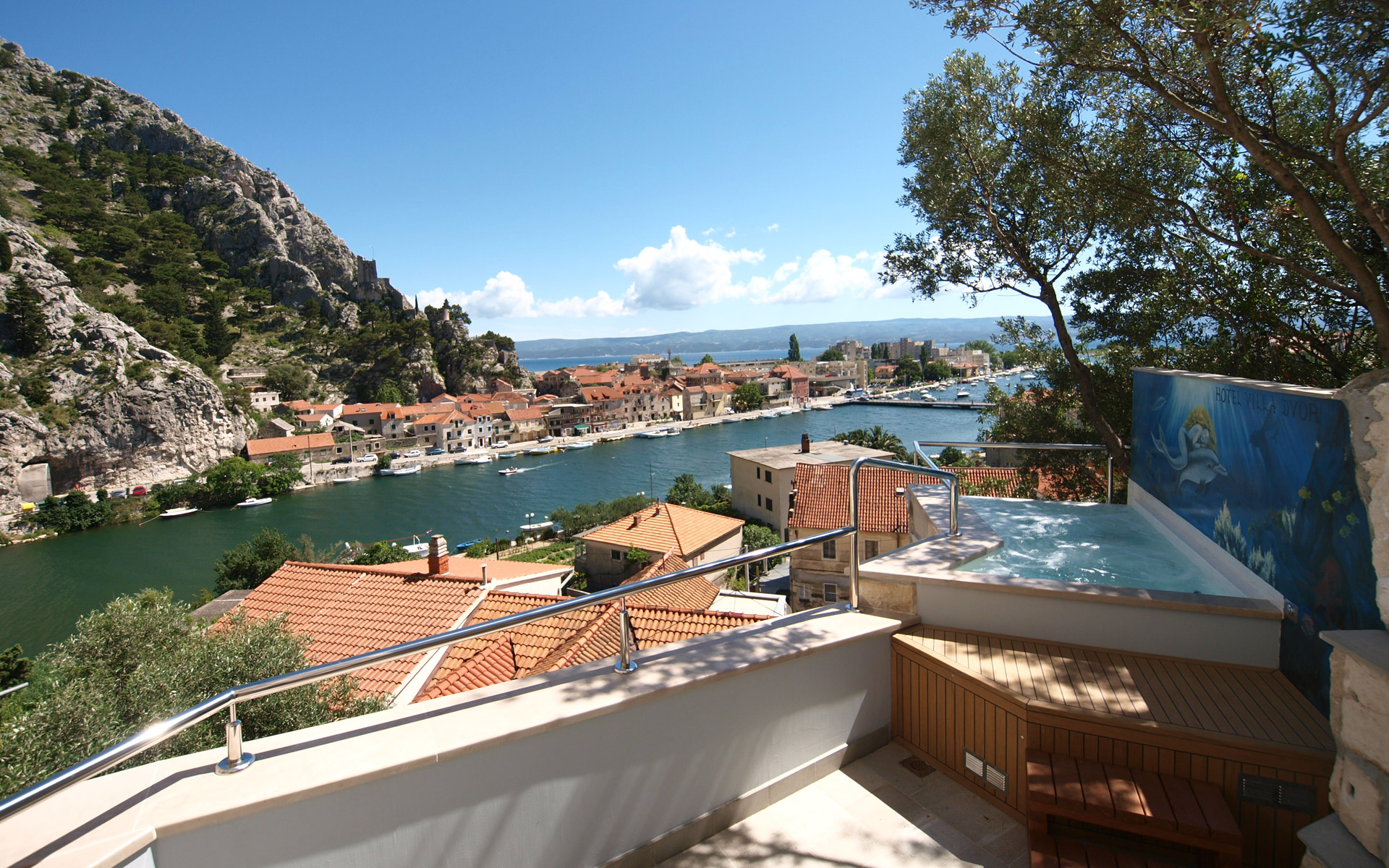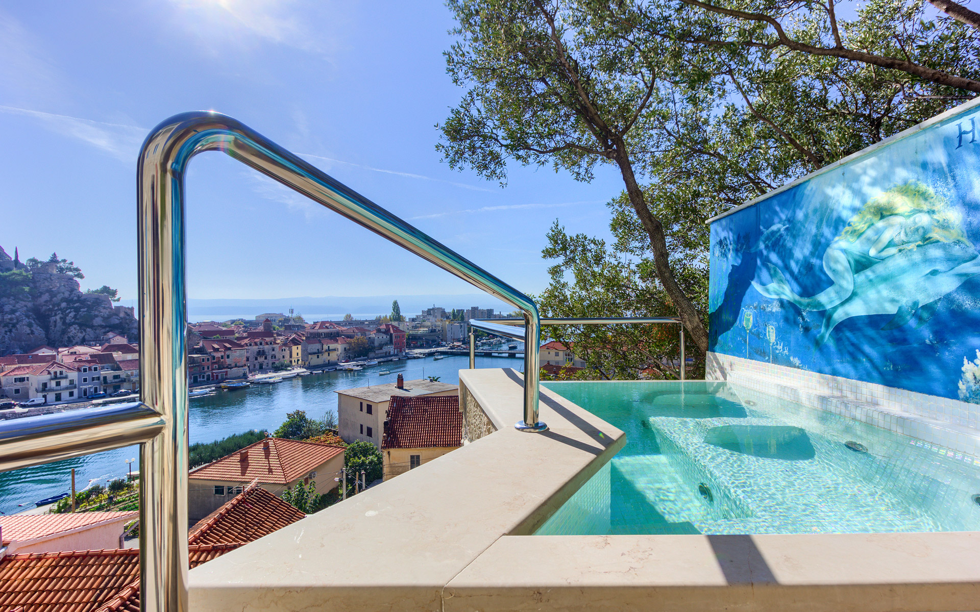 Cette chambre dispose d’un balcon de 10 m² avec une piscine privée (Plunge Pool). Profitez de moments inoubliables et romantiques depuis le confort de votre Plunge Pool, avec une vue spectaculaire sur l’estuaire de la rivière Cetina, la vieille ville d’Omiš et la forteresse Mirabela, la mer Adriatique, l’île de Brač, ainsi que sur les montagnes environnantes.
