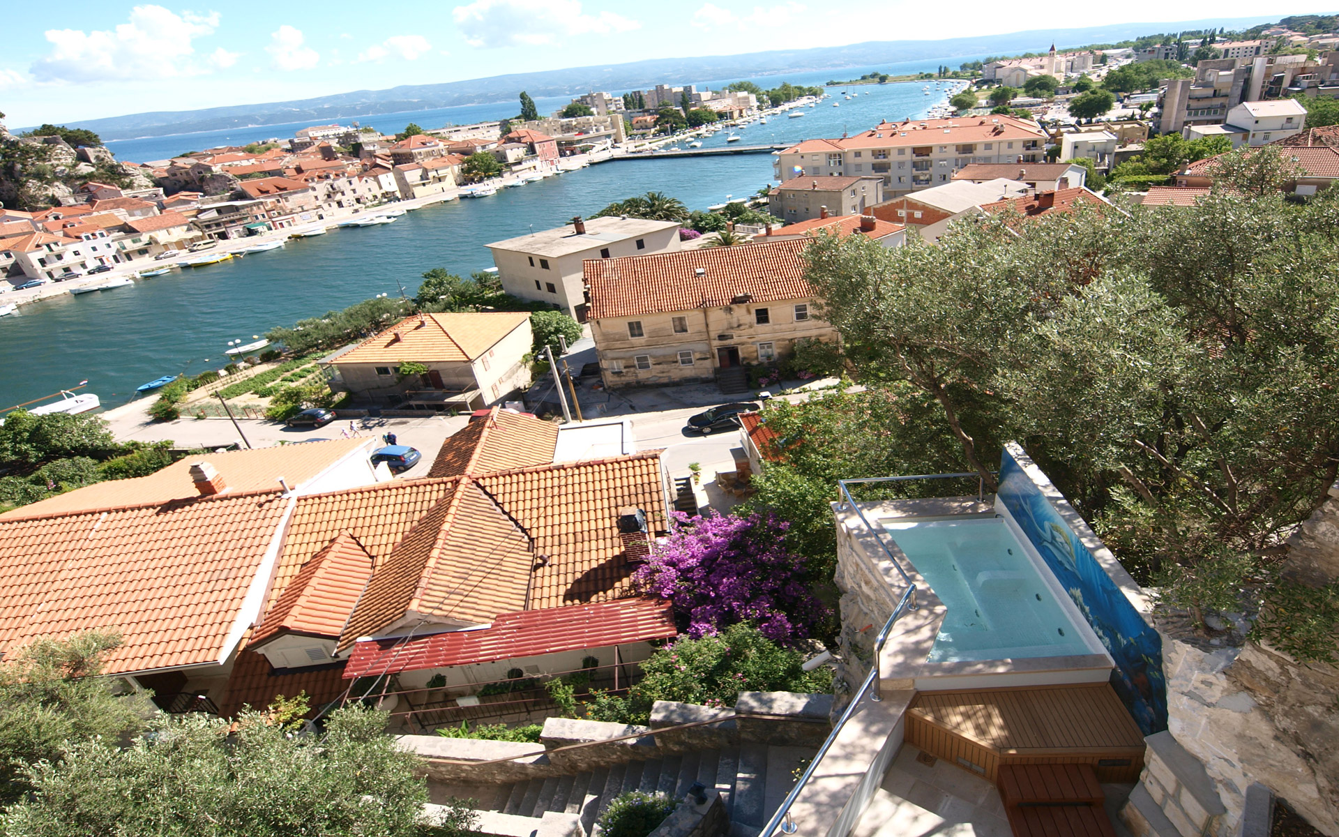 Vues : mer, embouchure de la rivière Cetina, vieille ville d’Omiš, montagnes